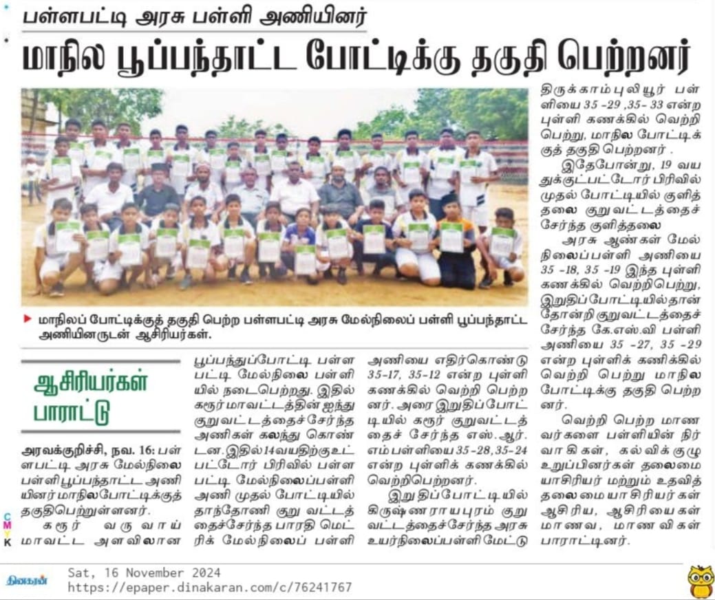 - Finally, in a closely contested final, they emerged victorious against Government High School, Thirukampuliyur, from the Krishnarayapuram zone, with scores of 35-29 and 35-33, earning them a spot in the state-level tournament.