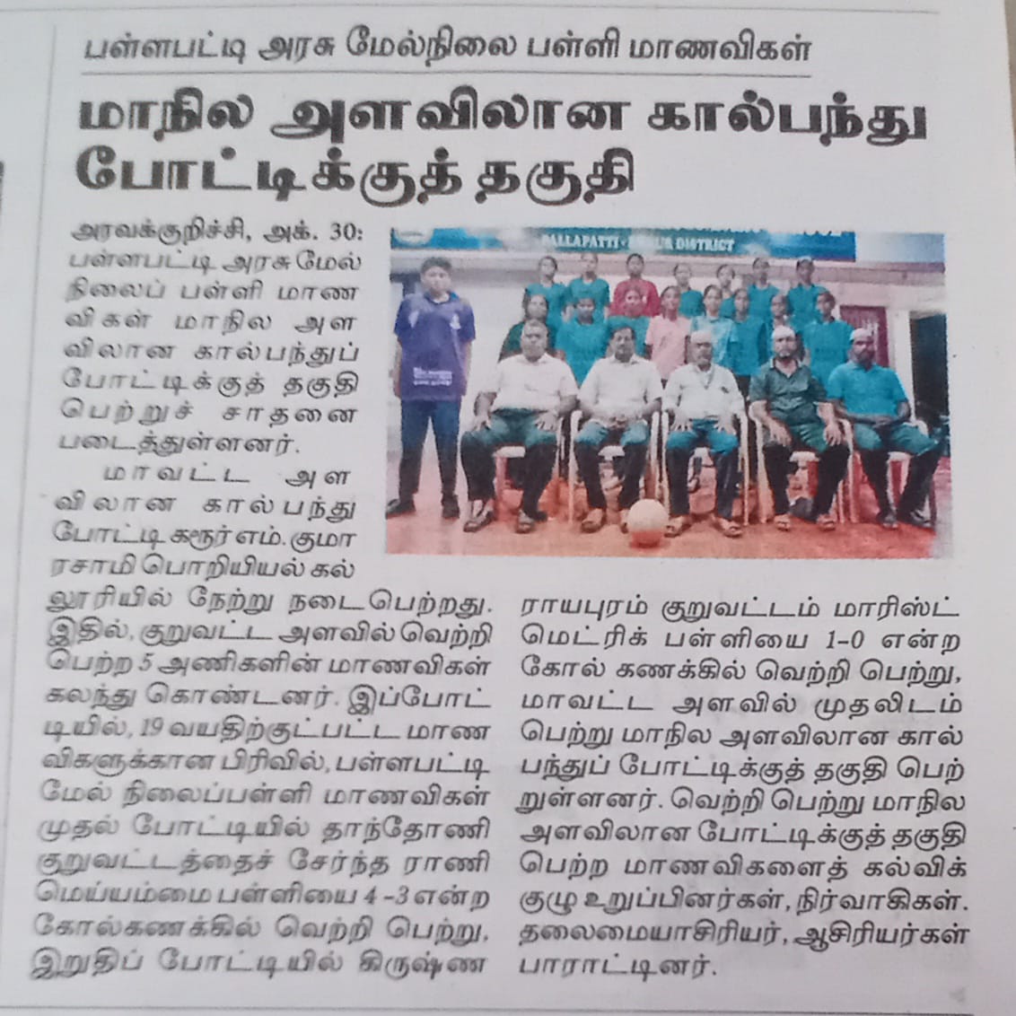 In the under 14 category, our team faced the Government Higher Secondary School from RT Malai in the first match and secured a solid victory with a score of 2 to 0. Advancing to the finals, they played against Chettinad Rani Meyyammai Matriculation School from the Thanthoni zone. It was an intense match that ended in a tie, leading to a tiebreaker. Our team triumphed with a 4 to 3 score in penalties, earning first place at the district level and qualifying for the state level tournament.