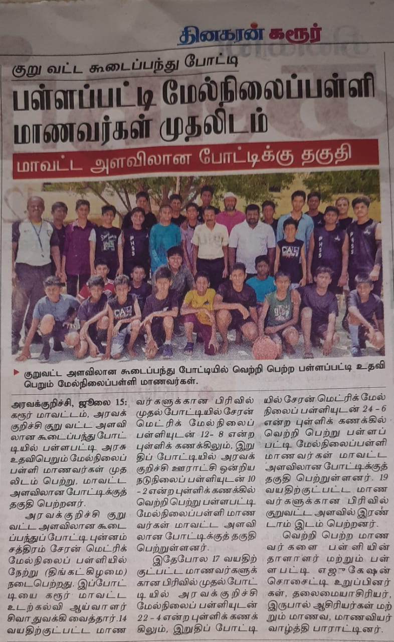 In the under-14 category, the team won their first match against Cheran Matric School with a score of 12-8, and triumphed in the final against Aravaikurichi Panchayat Union Middle School by 10-2, thereby qualifying for the district-level competition.
